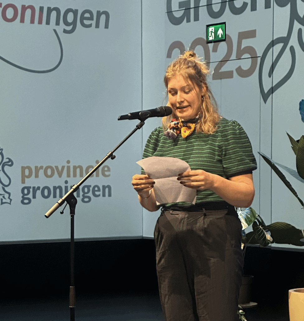 Ze droeg het voor tijdens de Nationale Groendag die donderdag 9 oktober in Groningen werd gehouden. Na een dag vol informatie, presentaties, excursies, deelsessies en discussies sloot Van den Boom de dag literair af met dit gedicht.
